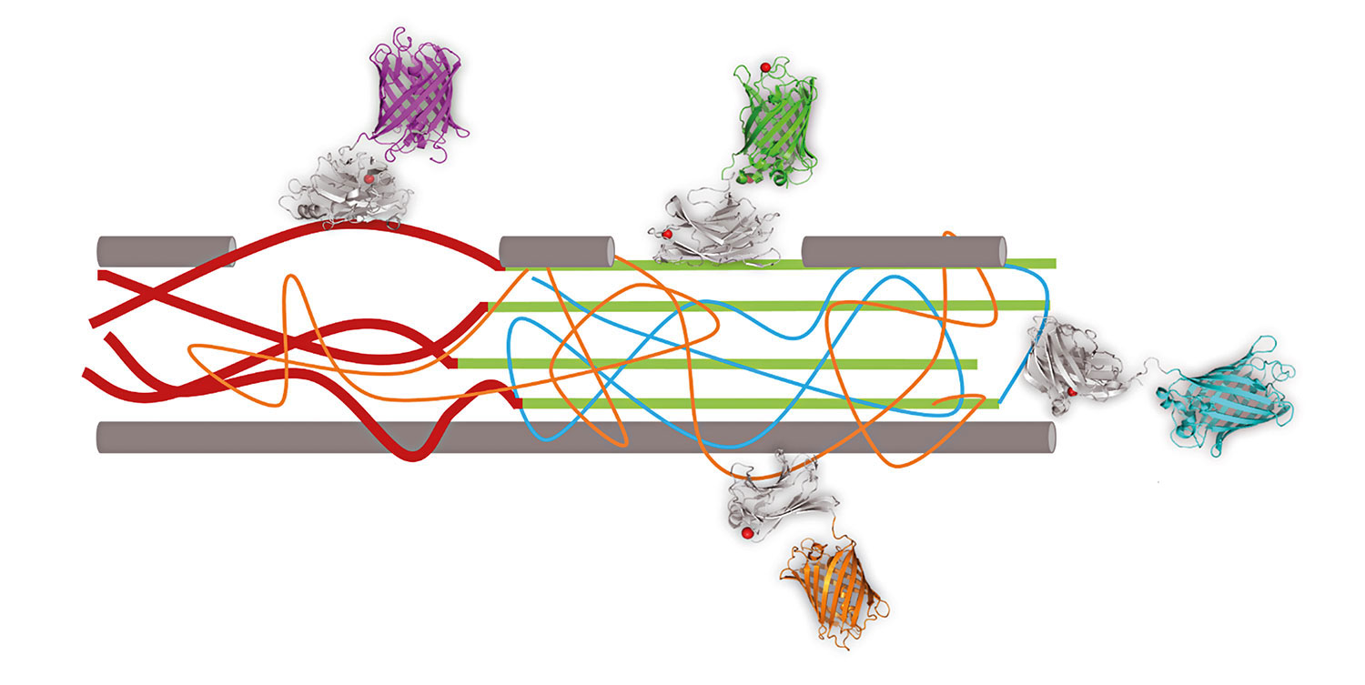 Buckman used a novel biomimicry approach to develop a more rapid testing methodology. This article summarizes the work contained in the original research publication (Ouellet et.al. 2017). Many carbohydrate degrading enzymes comprise three different components: a binding domain-CBM (attaches the enzyme in a specific way to the fiber), a catalytic domain (which breaks the specific bonds) and an interconnecting linker that keeps the two units separated, but together. Utilizing the specificity provided by four different CBMs, we combined them with four different colored fluorescent tags (e.g. a green fluorescent protein found in jellyfish (Voss et. al. 2013). The hybrid probes differentially bind to crystalline cellulose, amorphous cellulose, xylans and mannans, respectively. These chemical structures were chosen as they impact paper properties differentially (Fardim 2018). Simultaneous addition to a handsheet allows for a rapid relative quantification of the specific chemical moieties on the surface of the fibers (Figure 1). Figure 2 demonstrates what this looks like in pulp.