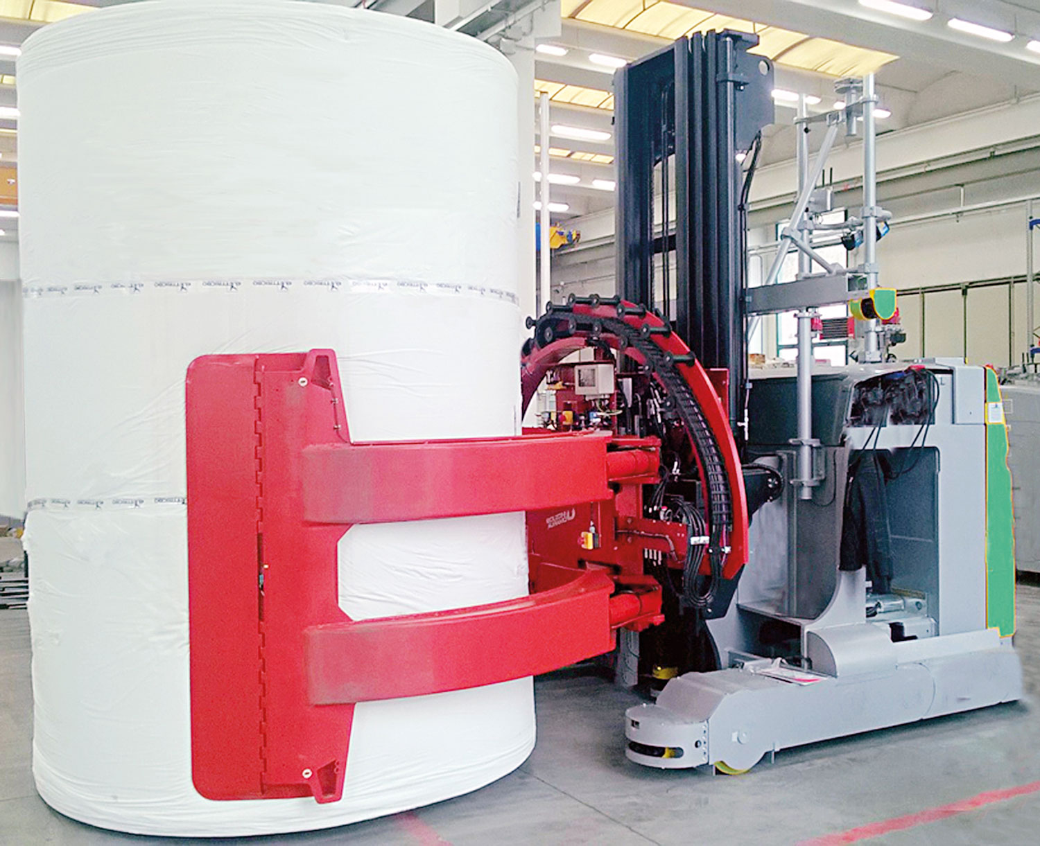 Linked to the Industry 4.0 philosophy implementation, and in strict cooperation with main AGV’s producers, Bolzoni Auramo has developed a range of tissue paper roll clamps equipped with specific sensors controlled and managed directly by the AGV control unit. The hydraulic system and the sensors set are co-designed with the LGV manufacturer and specifically adjusted to marry the control system of the automatic machine. To offer the