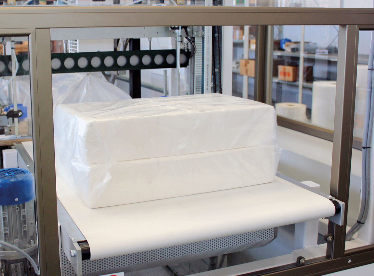 This type of packaging is especially well-suited to pre-packaged paper rolls for industrial use and individually packed folded products. The packaging process does not generate any wrapping material scraps or rejects, which cuts out disposal costs and allows a significant saving of wrapping material.