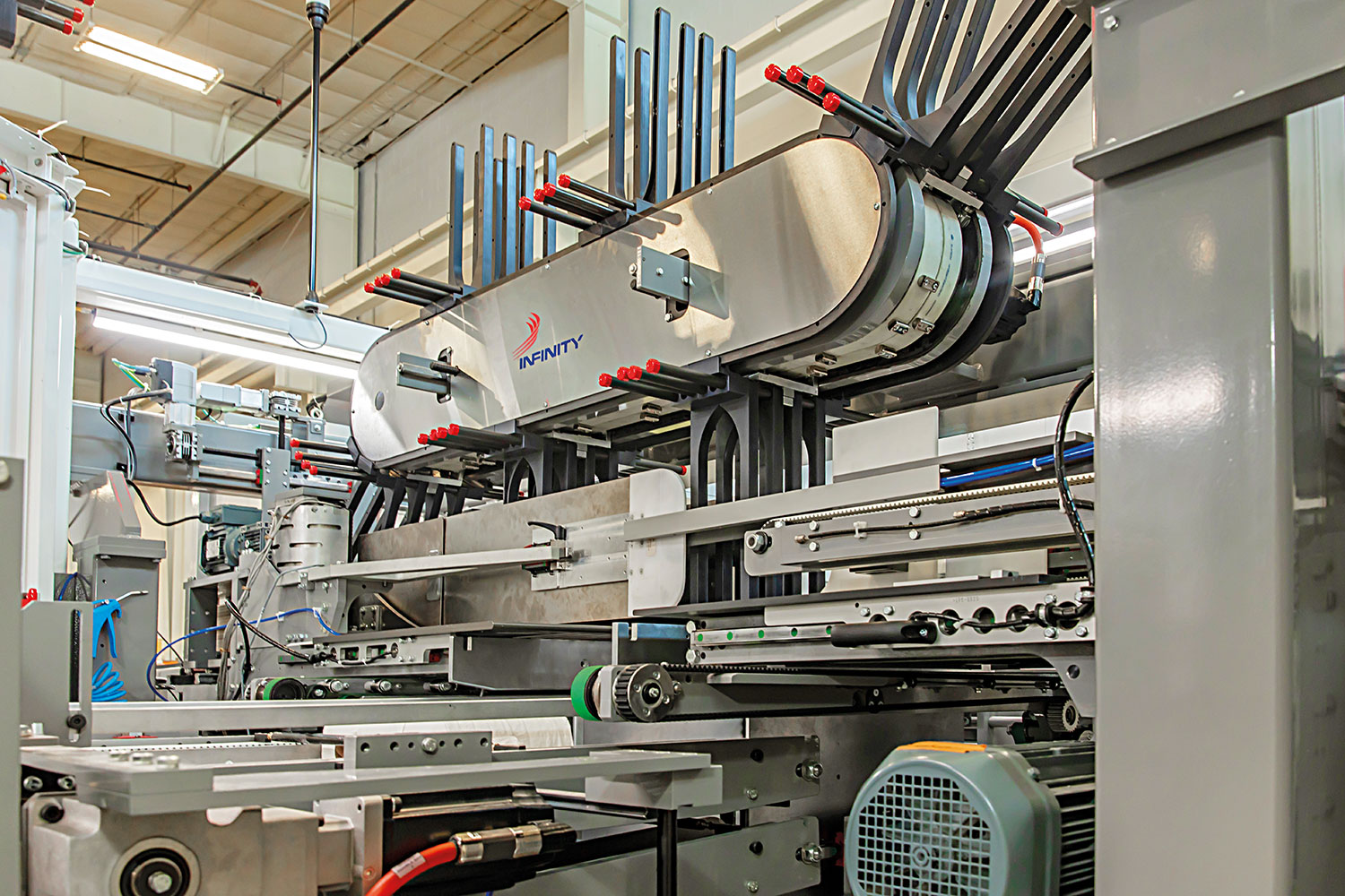 There are many distinct overall features that are worth noting as well, such as an easy three-piece shipping system. Since the wrapper’s frame, guarding and cabinets are integrated, Infinity can ship the machine to customers in three pieces, which allows customers to reduce the installation time of the machine to one day! This means that Infinity can have finished packs out of the machine by day two of an installation! Other overall features include a lower working height for shorter operators, no chains on the machine, no trapped belts on the machine, direct drive infeed belts (less pulleys and timing belts), closed loop 24V motors for automatic adjustments with torque feedback and the ability to add a third layer at a later time.