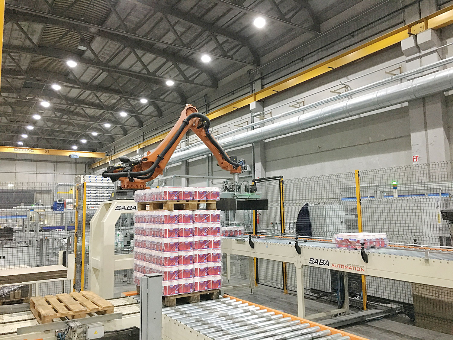 For this purpose, SABA AUTOMATION manufactures palletizing robots , a wide range of transport systems for products and pallets, automatic wrapping machines, labelling machines, and warehouse entry and exit areas. Automatic guided vehicles complete the range of end-of-line solutions.