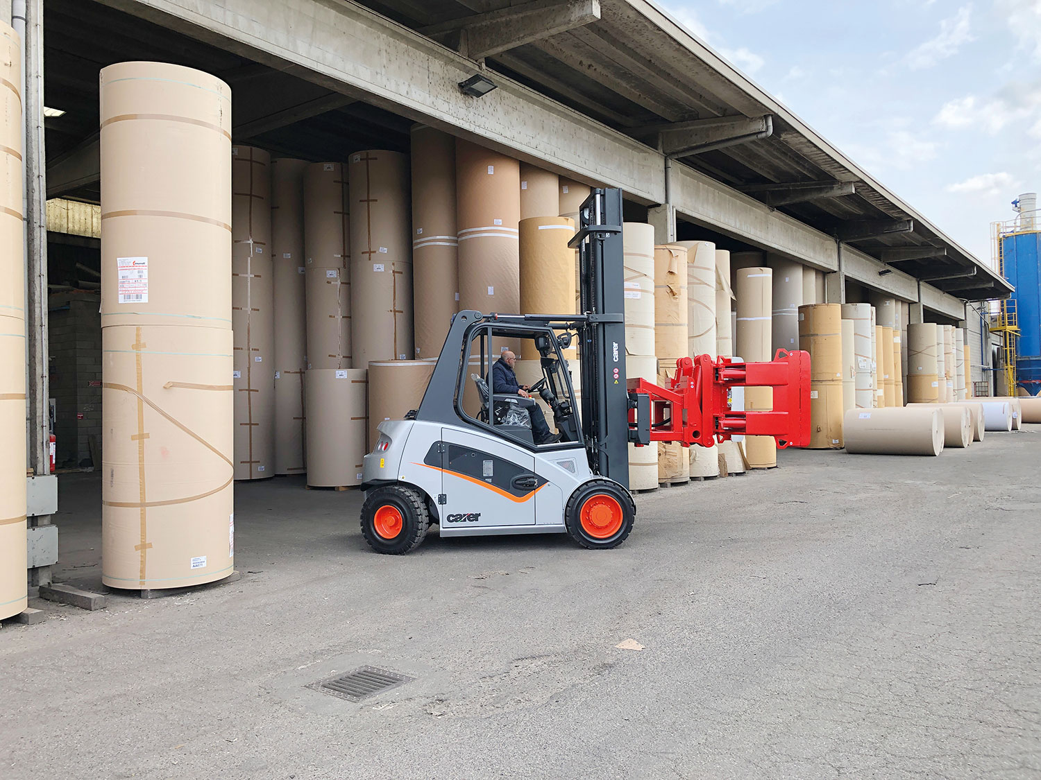 In recent years, Carer electric trucks have established themselves in the panorama of material handling as the ideal machines for the storage and handling of paper. For these applications, mainly carried out in indoor structures, where reels of 2.5 tons and up are handled (up to 6 tons in some special applications), trucks with 6 to 9 tons of capacity are required: thanks to the versatility of its electric trucks, with performance in all respects comparable to that of diesel machines, Carer has established itself on the market in the paper sector, distinguishing itself from its competitors. The reasons for this success depend on a combination of factors: