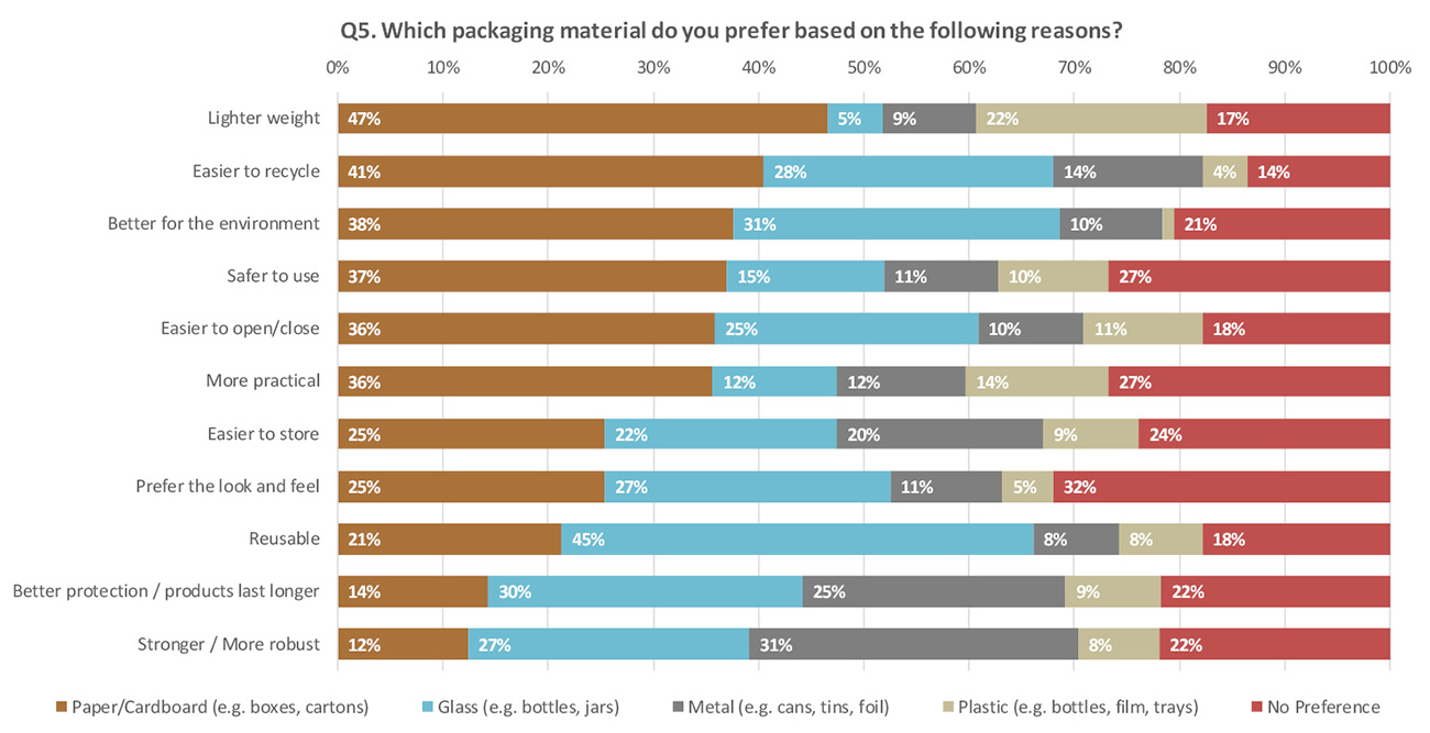 Respondents were asked which packaging material (glass, metal, paper & cardboard, or plastic) they prefer based on a number of different reasons. Paper & cardboard received the highest score for being; better for the environment and easier to recycle and, in terms of practicality, easier to open and close, easier to store, lighter weight, more practical, and safer to use.