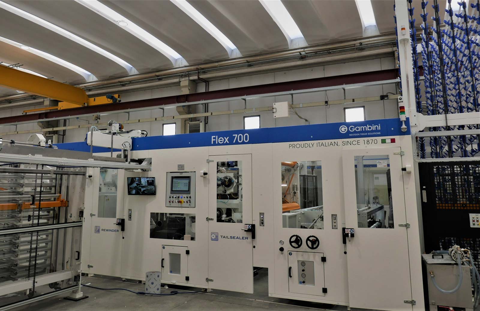 The Flex700 is Gambini’s top-level line for making consumer products; beyond its speed of 700 m/min (2,297 fpm) and 60 logs/min, it features one of the most game-changing pieces of machinery ever introduced in the converting industry: the TouchMax.