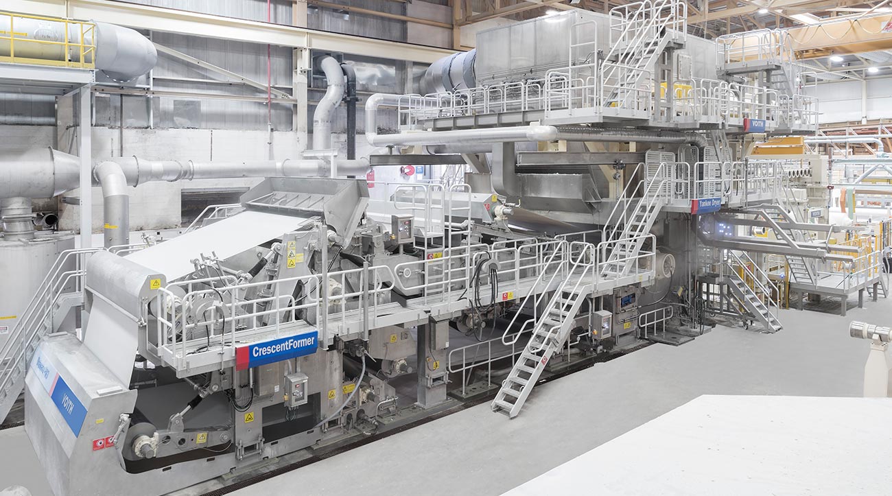 All of the new VTM 3’s technologies and components are seamlessly coordinated and integrated with each other. Besides the new XcelLine tissue paper machine and its auxiliary equipment – not counting the Yankee cylinder, which has been reused from the old machine – Voith’s scope of supply also included stock preparation and approach flow systems, a steam box, a gas hood, and a mist removal and dust reduction system. The order was rounded off by Voith’s automation package, comprised of the DCS and MCS systems, as well as field services.